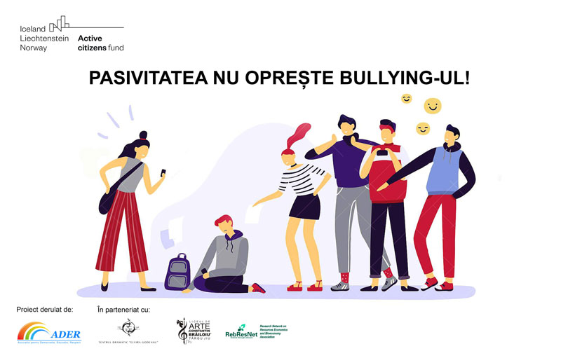 Proiectul are drept principale obiective: creșterea gradului de conștientizare a efectelor nocive ale bullying-ului; prevenirea și combaterea bullying-ului. Activitățile din cadrul proiectului se adresează elevilor, profesorilor și părinților din județele Gorj și Prahova și se va derula în parteneriat cu: Liceul de Arte ,,Constantin Brăiloiu” din Târgu- Jiu, Teatrul Dramatic ,,Elvira Godeanu” din Târgu-Jiu și Asociația ,,Research Network on Resources Economics and Bioeconomy” din Ploiești. De rezultatele acestui proiect vor beneficia direct peste 1.300 de elevi, 100 de profesori și 100 de părinți. Proiectul beneficiază de o finanțare în valoare de 40.866 de euro, prin programul Active Citizens Fund România, finanțat de Islanda, Liechtenstein și Norvegia prin Granturile SEE 2014-2021.