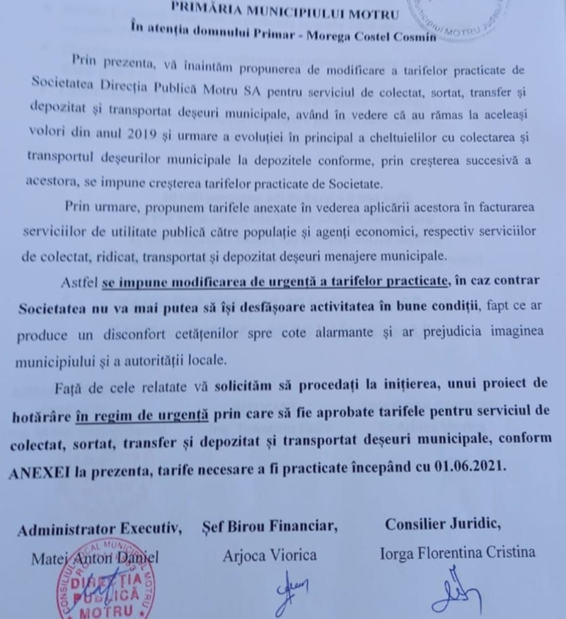 Cu toate că Prefectura și CJ Gorj au dat un punct de vedere legat de creșterea tarifului gunoiului menajer, autoritățile în cauză considerând că nu sunt motive pentru majorarea acestuia, Matei s-a gândit că este oportun să ceară CL și Primăriei Motru majorarea tarifului pentru gunoiul menajer.
