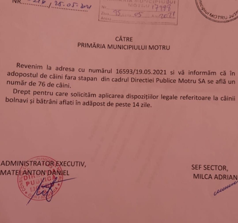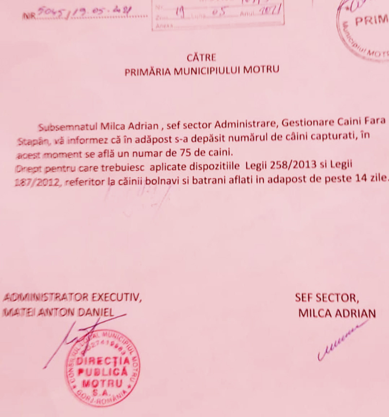 De altfel, și eutanasierea pe care o solicită, sperând că primăria nu va răspunde pozitiv la cererea sa, este un alt tertip al acestuia, având în vedere că nu a reușit în ultimii ani de zile să rezolve problema câinilor fără stăpân. În loc să facă campanii de sterilizare, adopție, promovare a câinilor pe diferite site-uri, colaborare cu ONG-uri, îi este mai simplu să ceară eutanasierea bietelor animale, considerând că pune în dificultate funcționarii primăriei. DP Motru are un target de capturare a cel puțin 30 de câini pe lună, 10 adopții și minim 5 sterilizări, până la eliminarea acestor patrupede de pe străzile municipiului. Primăria alocă lunar sume cuprinse în 35.000-55.000 de lei pentru acest adăpost de câini al DP Motru, dar, cu toate acestea, mai multe persoane au sesizat că au fost mușcate de acești câini. Patrupedele nu au nicio vină, câinii fiind flămânzi, speriați și căutând să se apere. Deviza fostului primar, în 2016, a fost că în șase luni de zile va rezolva problema câinilor fără stăpâni, lucru continuat acum de administratorul executiv, care își va pune în cap toți iubitorii de animale, angajații societății, doctorii veterinari, dar și ONG-urile de protecție a animalelor. Primăria, dacă nu va da curs acestor solicitări, se va trezi cu reclamații potrivit cărora nu respectă legea, iar societatea nu își poate îndeplini obligațiile din contract. Menționăm că astfel, gunoiul la Motru, din ce dorește administratorul executiv, va ajunge la cel mai mare preț din județ, asta dacă primăria va da curs solicitării, iar CL va aproba. Primarul Morega a anunțat public, la emisiuni radio-tv, că nu este de acord cu creșterile la tariful de gunoi, iar pentru câinii fără stăpâni, până la eutanasiere, există multe alte variante care pot fi puse în practică de cei în cauză.