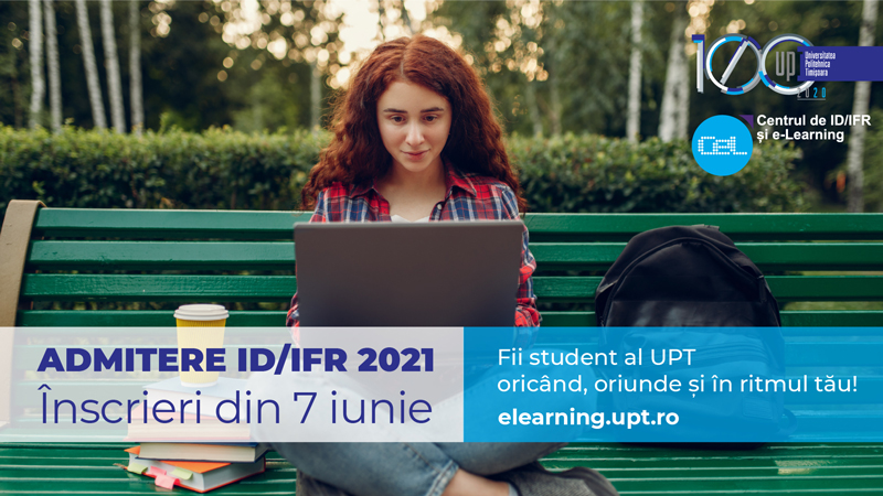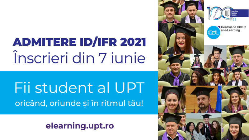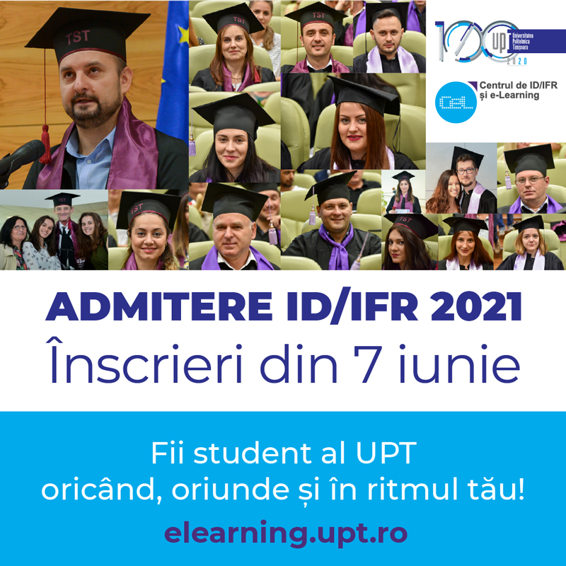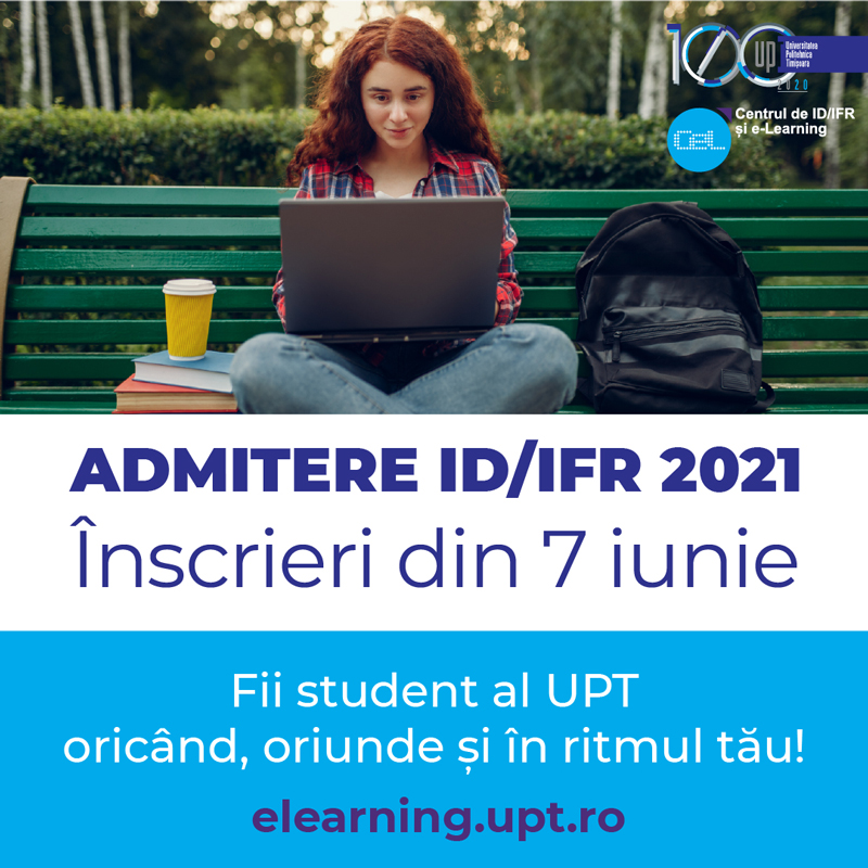 Fii student al UPT oricând, de oriunde și în ritmul tău! În 7 iunie dăm startul pentru concursul de ADMITERE ID/IFR 2021. Optează pentru înscrierea online sau la universitate! Cursurile și tutorizarea, comunicarea, temele și notele sunt administrate online prin platforma Campus Virtual UPT. Activitățile de laborator, seminar și examenele au loc numai în weekend. Cursurile și cadrele didactice, competențele, titlul și profesia sunt aceleași cu studiile la forma de învățământ la zi. Echipa de Suport dedicată ID/IFR îți stă la dispoziție, atât în perioada de admitere, cât și pe parcursul anilor de studiu!