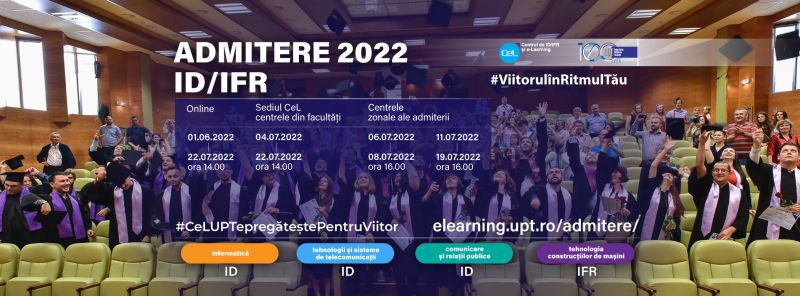 Fii student al Universității Politehnica Timișoara oricând, de oriunde și în ritmul tău! În 1 Iunie dăm startul pentru concursul de ADMITERE ID/IFR 2022 – online. Optează pentru înscrierea online, sau din 4 Iulie la universitate și din 6 Iulie în centrele zonale dedicate admiterii!