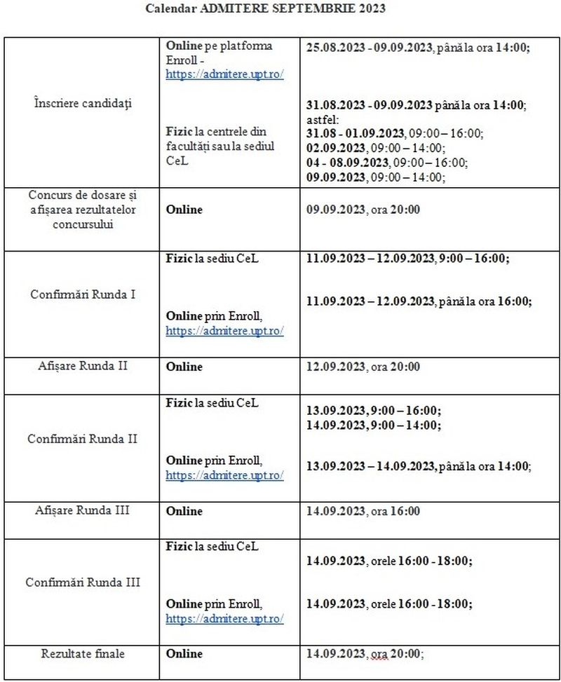 Înscrierea la concursul de admitere cu depunerea actelor necesare și întreg procesul de admitere și confirmare a locului, pentru anul universitar 2023-2024 se poate realiza atât online – folosind aplicația dedicată Enroll (https://admitere.upt.ro/), cât și fizic, la centrele din facultăți sau sediul CeL (Bulevardul Vasile Pârvan, nr. 2) sau centrele zonale dedicate admiterii, personal de către fiecare candidat.