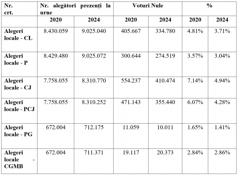 În privinţa alegerilor pentru primari, în 2020 au fost 300.644 de voturi nule (3,57%), iar la alegerile din 9 iunie, 274.519 voturi nule (3,04%).