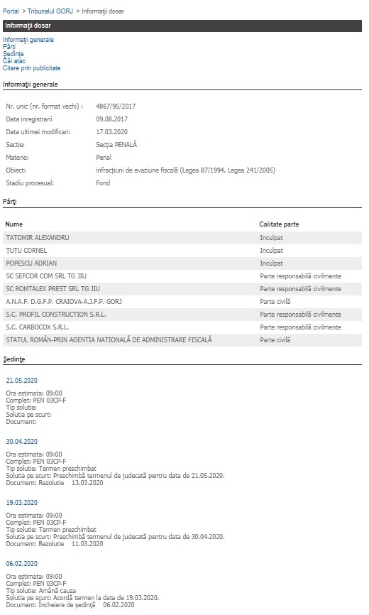Dosarul de evaziune, pe rolul Tribunalului Gorj!