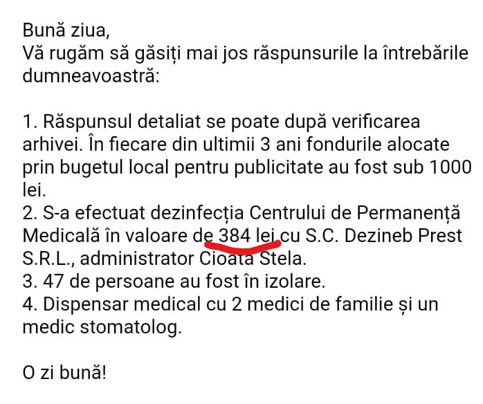 Dezinfecție s-a făcut de către DEZINEB PREST și la Bălănești, în valoare de peste 10.000 de lei, dar edilul din această localitate, se pare, că nu a acceptat încă factura la plată. Pe listă sunt și alte primării care au bătut palma cu firma viceprimarului de Godinești, în special cu primari PSD.