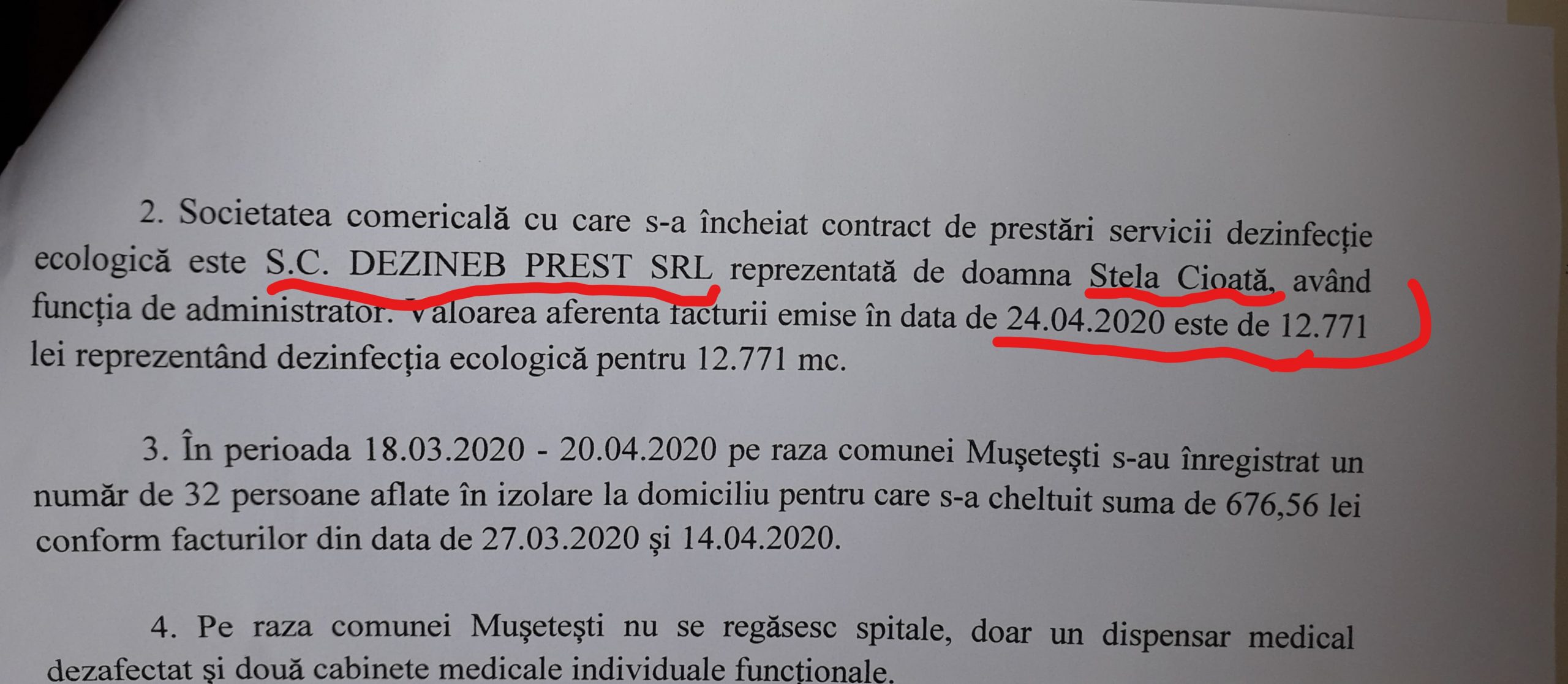 A treia primărie dezinfectată de DEZINEB PREST a fost cea de la Mușetești. Primăria Mușetești i-a băgat în buzunarul vicelui PSD pentru o dezinfecție ecologică 12.771 de lei, semn că patronul a vrut să-și acopere și amenda primită la Motru. Lucrarea s-a efectuat în luna aprilie. Și aici au ajuns polițiștii de la economic ai IPJ Gorj, confirmă responsabilii instituției, la cererea Gorjeanul. De altfel, lucrarea nu este un secret, primăria răspunzând că lucrarea s-a efectuat, în localitate fiind un centru de carantină.