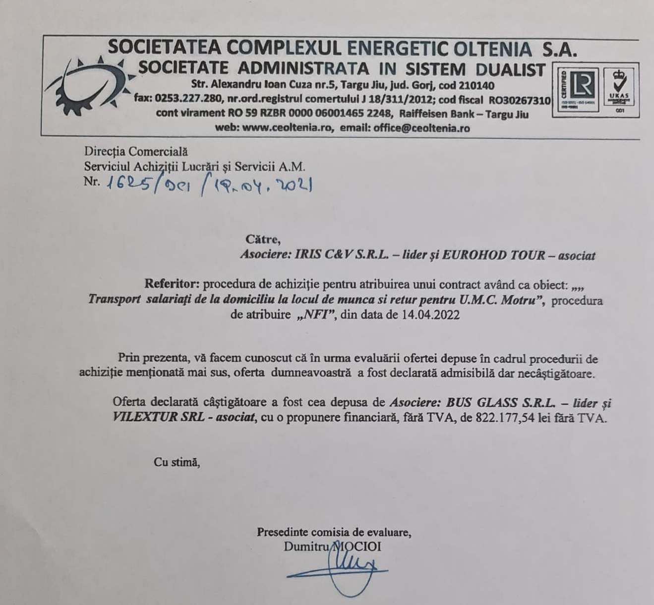 ora 0.00. Firma din Vâlcea este astfel obligată ca următoarea cursa a minerilor să fie realizată de mijloacele de transport ale acestei asocieri. Asta, în condițiile în care societatea respectivă nu are parcare și organizarea făcută. Transportul minerilor din Motru va fi cu siguranță perturbat, în condițiile în care există o firmă trasă pe dreapta, în timp ce o licitație pe același trasee încă se evaluează în SEAP, fiind în etapa de evaluare financiară.