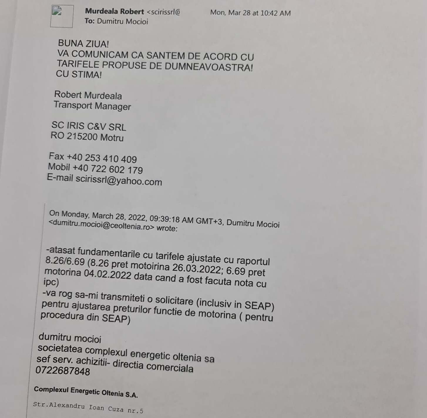 Contractul de transport al minerilor din Motru, adică pentru carierele din Lupoaia, Roșiuța, UIC și ElCFU, cu firma SC IRS C&V SRL a expirat marți noaptea, la orele 0.00. CEO a organizat, însă, între timp, o licitație care a avut termen de depunere a ofertelor pe 8 aprilie. Fiind în evaluare licitația din SEAP, CEO a transmis însă o invitație de participare la o procedură NFI (necesar fără publicare în SEAP), pentru 14 aprilie. La procedură s-a prezent
