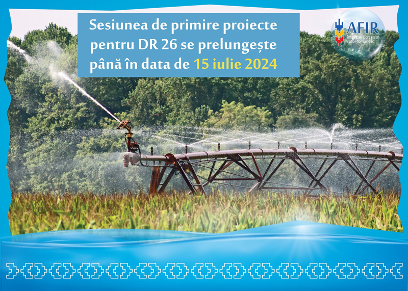 Agenția pentru Finanțarea Investițiilor Rurale (AFIR) anunță prelungirea cu încă două luni a sesiunii de primire a cererilor de finanțare pentru DR-26 Înființarea sistemelor de irigații, intervenție finanțată cu fonduri din Planul Strategic 2023 – 2027.