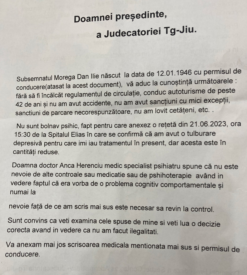 Filmările de zilele trecute îl arată însă pe fostul politician conducând o mașină care are girofar albastru, motiv pentru care și taie linia dublă continuă, după care virează brusc dreapta, prin fața altor autoturisme. Pentru toate acestea, Morega are câte o explicație, el considerându-se complet nevinovat pentru situația în care se află. El a contestat în instanță decizia polițiștilor de a-i anula dreptul de a mai șofa, iar în spațiul public a făcut o serie de declarații la sfârșitul săptămânii pentru a explica situația în care se află. „Nu am niciun permis suspendat. Au venit la mine polițiștii și au făcut procese verbale. De la Târgu Jiu au venit. Șeful Poliției Rutiere de la Gorj, Săvulescu, a trecut peste cel de la Municipiu și și-a luat niște agarici ca să facă un proces verbal de suspendare a permisului. Ei nu trebuiau să mai apară deloc pentru că eu am depus plângere la Ministerul de Interne, la Judecătoria Târgu Jiu și trebuiau să aștepte ce spune instanța. Chiar dacă mi-au ridicat permisul, 15 zile trebuiau să mă lase în pace, conform legii. Cum îți permiți să suspenzi permisul pe 2 luni, la un cetățean, după o hârtie de la un medic care, ați văzut, nu e pe creaca ei!? A fost dată afară de la spitalul de stat de la Târgu Jiu și și-a făcut un cabinet privat. Ea a venit la domiciliul meu și mi-a spus că nu ar trebui să circul cu mașina, dar eu nu am probleme. Eu am fost la Spitalul Universitar Elias și am document că sunt foarte bine cu starea de sănătate. Mi-au spus medicii, după RMN, că aș avea chiar vârsta de 30-40 de ani. Totul a pornit de la fiica mea, a fost o discuție mai dură”, a menționat Morega, care recunoaște că în plan familial nu mai este în relații bune cu nimeni.