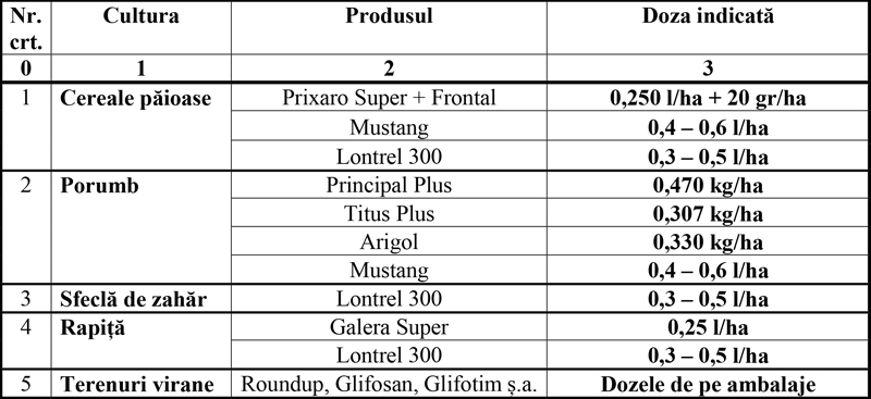 Notă – în cazul ierbicidării totale cu Roundup sau alte produse pe bază de glifosat se poate face și ierbicidarea punctuală, aplicând produsele numai pe plantele de ambrozia, de preferință înainte de începutul înfloritului.