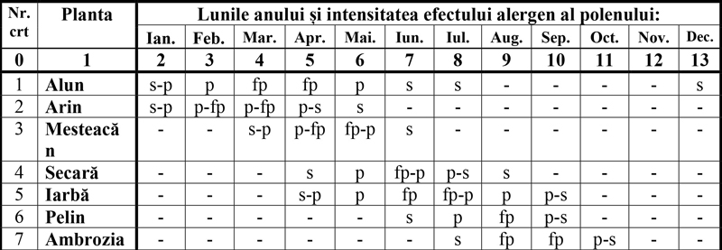 Notăsemnificația notațiilor este: s = efect alergen slab; p = efect alergen puternic; fp = efect alergen foarte puternic; s-p = efect alergen slab în prima parte a intervalului și puternic în partea a doua; p-fp = efect alergen puternic în prima parte a intervalului și foarte puternic în a doua parte; fp-p = efect alergen foarte puternic în prima parte a intervalului și puternic în a doua parte; p-s = efect alergen puternic în prima parte și slab în partea a doua a intervalului.