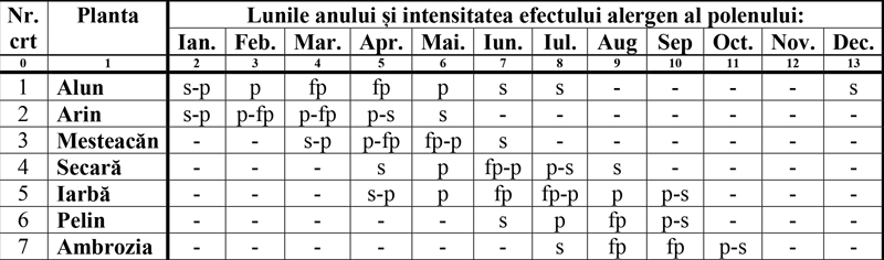 Notă – semnificația notațiilor este: s = efect alergen slab; p = efect alergen puternic; fp = efect alergen foarte puternic; s-p = efect alergen slab în prima parte a intervalului și puternic în partea a doua; p-fp = efect alergen puternic în prima parte a intervalului și foarte puternic în a doua parte; fp-p = efect alergen foarte puternic în prima parte a intervalului și puternic în a doua parte; p-s = efect alergen puternic în prima parte și slab în partea a doua a intervalului.