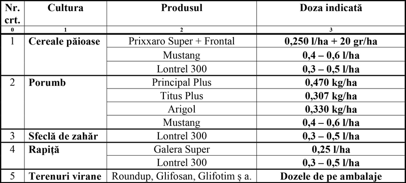 Notă – în cazul erbicidării totale cu Roundup sau alte produse pe bază de glifosat, se poate face și erbicidarea punctuală, aplicând produsele numai pe plantele de ambrozia, de preferință înainte de începutul înfloritului.
