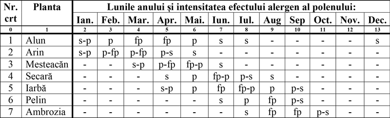 Notă – semnificația notațiilor este: s = efect alergen slab; p = efect alergen puternic; fp = efect alergen foarte puternic; s-p = efect alergen slab în prima parte a intervalului și puternic în partea a doua; p-fp = efect alergen puternic în prima parte a intervalului și foarte puternic în a doua parte; fp-p = efect alergen foarte puternic în prima parte a intervalului și puternic în a doua parte; p-s = efect alergen puternic în prima parte și slab în partea a doua a intervalului.