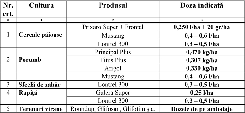 Notă – în cazul ierbicidării totale cu Roundup sau alte produse pe bază de glifosat, se poate face și ierbicidarea punctuală, aplicând produsele numai pe plantele de ambrozia, de preferință înainte de începutul înfloritului.