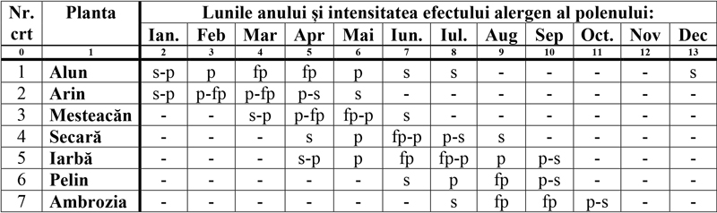 Notă – semnificația notațiilor este: s = efect alergen slab; p = efect alergen puternic; fp = efect alergen foarte puternic; s-p = efect alergen slab în prima parte a intervalului și puternic în partea a doua; p-fp = efect alergen puternic în prima parte a intervalului și foarte puternic în a doua parte; fp-p = efect alergen foarte puternic în prima parte a intervalului și puternic în a doua parte; p-s = efect alergen puternic în prima parte și slab în partea a doua a intervalului.