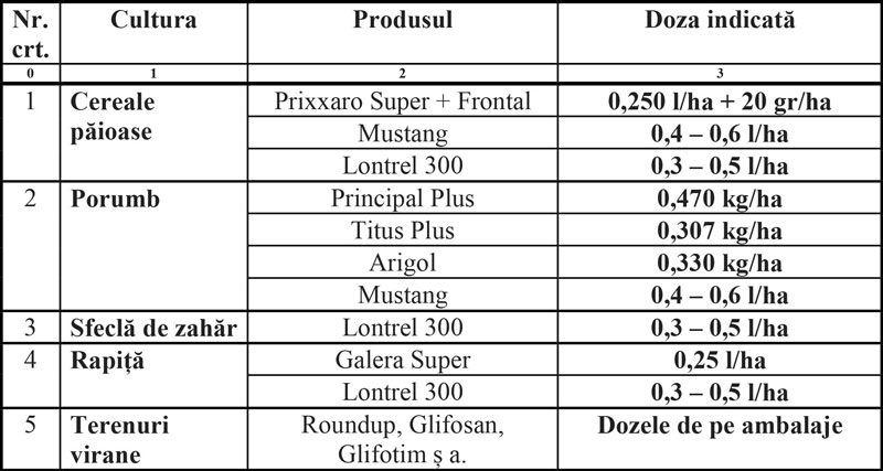 Notă – în cazul ierbicidării totale cu Roundup sau alte produse pe bază de glifosat se poate face și ierbicidarea punctuală, aplicând produsele numai pe plantele de ambrozia, de preferință înainte de începutul înfloritului.
