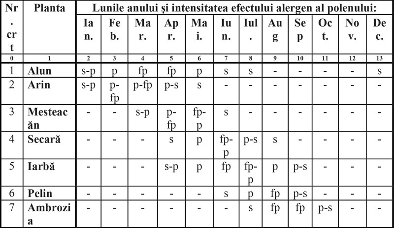 Notă – semnificația notațiilor este: s = efect alergen slab; p = efect alergen puternic; fp = efect alergen foarte puternic; s-p = efect alergen slab în prima parte a intervalului și puternic în partea a doua; p-fp = efect alergen puternic în prima parte a intervalului și foarte puternic în a doua parte; fp-p = efect alergen foarte puternic în prima parte a intervalului și puternic în a doua parte; p-s = efect alergen puternic în prima parte și slab în partea a doua a intervalului.
