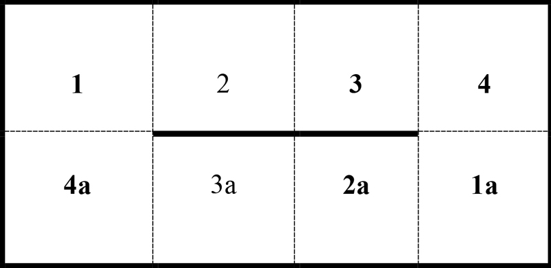 1 – Schița unui modul cu 2 x 4 compartimente. Linia întreruptă presupune pereții despărțitori prevăzuți cu ferestre de comunicare în partea inferioară