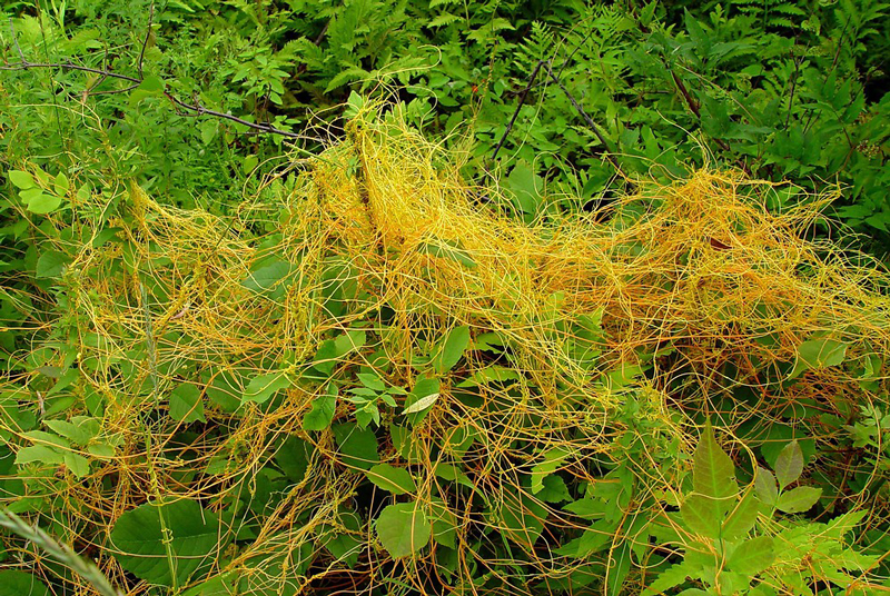 Nici rădăcini propriu-zise nu are căci se agață de plantele parazitate prin înfășurarea filamentelor în sens invers acelor de ceas (sens direct trigonometric) în jurul acestora și cu haustorii, niște rădăcini aeriene terminate cu ventuze și adevărate gheare care se înfig în floemul, țesutul fraged de la exteriorul tulpinilor plantelor parazitate, și sug din el seva gata preparată. Tulpinile filiforme sunt groase de 1 – 1,5 mm, dar pot ajunge până la 5 m lungime, răsucite strâns în jurul plantelor, ca un ghemotoc de sârmă, prevăzute cu numeroase noduri din care pornesc rădăcinile (ghearele) și inflorescențele, căci planta se înmulțește și prin semințe, dar și vegetativ – prin fragmente de tulpină care să conțină măcar un nod. Se apreciază că plantele de cuscută au senzori chimici, probabil și oarecare inteligență, căci acestea se agită în aer și se îndreaptă numai către plantele gazdă a căror amprentă chimică probabil că o depistează în apropiere, neprezentând interes pentru celelalte plante.