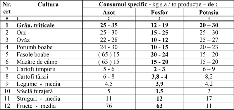 Iarna, neobișnuit de călduroasă de până acum, a favorizat continuarea vegetației cerealelor de toamnă, chiar la intensitate mare, ceea ce a condus la extragerea din sol de cantități sporite de elemente nutritive și deci se impune, mai mult ca oricând, completarea acestora prin fertilizare fazială în acest timp. Pentru producerea unei tone de producție principală, împreună cu producția secundară aferentă acesteia, culturile agricole extrag din sol cantități însemnate de substanțe chimice denumite elemente nutritive. Redăm în tabelul de mai jos consumurile specifice de elemente nutritive pentru principalele culturi agricole specifice Gorjului.