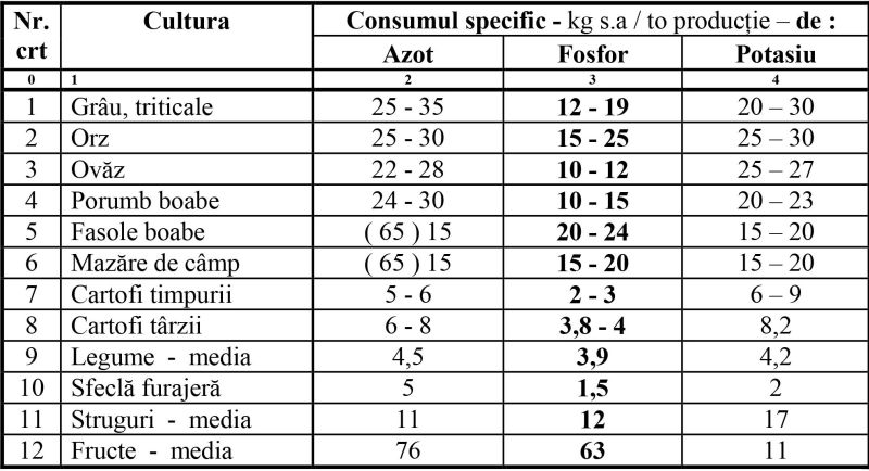 Iarna neobișnuit de călduroasă de până acum a favorizat continuarea vegetației cerealelor de toamnă, chiar la intensitate mare, ceea ce a condus la extragerea din sol de cantități sporite de elemente nutritive și deci se impune, mai mult ca oricând, completarea acestora prin fertilizare fazială în acest timp. Pentru producerea unei tone de producție principală, împreună cu producția secundară aferentă acesteia, culturile agricole extrag din sol cantități însemnate de substanțe chimice denumite elemente nutritive. Redăm în tabelul de mai jos consumurile specifice de elemente nutritive pentru principalele culturi agricole specifice Gorjului.