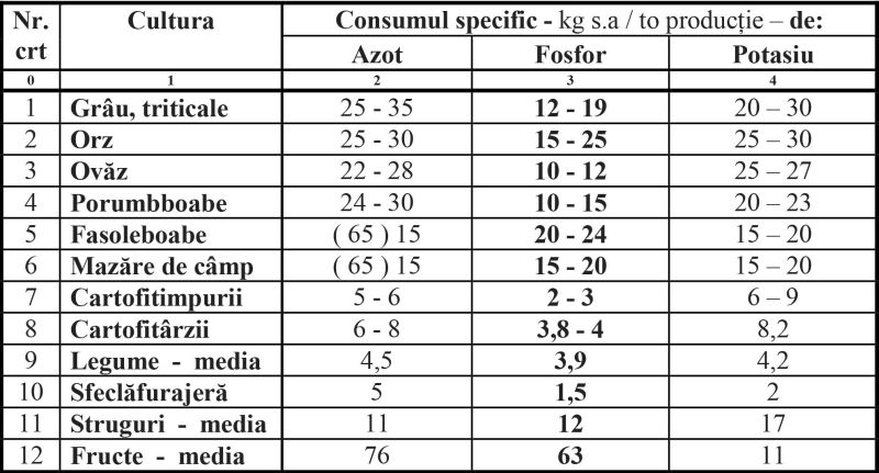 Iarna neobișnuit de călduroasă până acum a favorizat continuarea vegetației cerealelor de toamnă chiar la intensitate mare ceea ce a condus la extragerea din sol de cantități sporite de elemente nutritive și deci se impune mai mult ca oricând completarea acestora prin fertilizare fazială în acest timp. La data aceasta ne aflăm practic în ultimele zile când mai putem efectua corect administrarea fertilizanților faziali la cerealele păioase de toamnă. Este deci imperios necesar să o facem acum căci pe măsură ce întârziem culturile avansează rapid în vegetație și aplicarea îngrășămintelor va afecta grav plantele din cauza efectului caustic pe care acestea îl au. Pentru producerea unei tone de producție principală, împreună cu producția secundară aferentă acesteia, culturile agricole extrag din sol cantități însemnate de substanțe chimice denumite elemente nutritive. Redăm în tabelul de mai jos consumurile specifice de elemente nutritive pentru principalele culturi agricole specifice Gorjului.