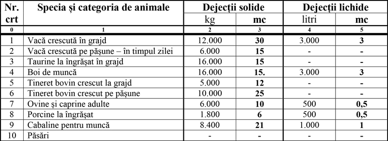 c – estimarea spaţiului necesar depozitării gunoiului de grajd se face în funcţie de numărul de animale, utilizând valoarea productiei zilnice de gunoi (inclusiv așternutul) pe cap de animal și volumul lunar al gunoiului care trebuie stocat pe cap de animal;