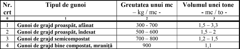 Greutatea medie a unui metru cub și volumul unei tone de gunoi de grajd