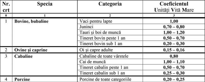 Coeficienții de transformare în UVM a diferitelor specii și categorii de animale