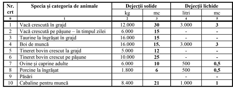 c – estimarea spaţiului necesar depozitării gunoiului de grajd se face în funcţie de numărul de animale, utilizând valoarea producției zilnice de gunoi (inclusiv așternutul) pe cap de animal și volumul lunar al gunoiului care trebuie stocat pe cap de animal;