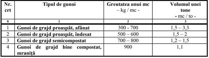 Greutatea medie a unui metru cub și volumul unei tone de gunoi de grajd