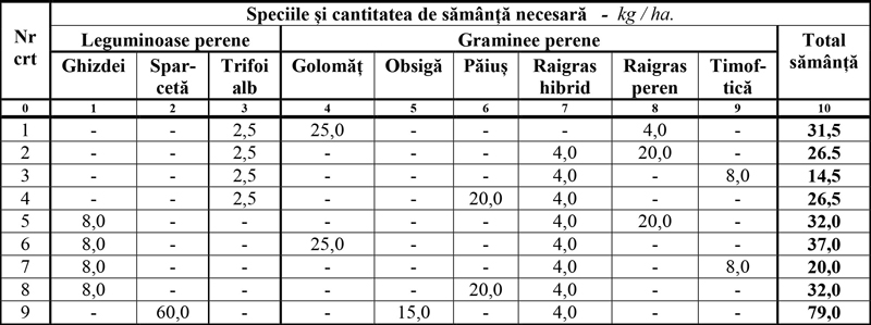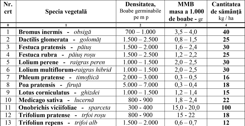 Notă: – Densitatea și norma de sămânță de mai sus sunt stabilite pentru cultuă pură. Pentru amestecuri perene acestecantități se reduc la procentul de participare al fiecărei specii în amestec.