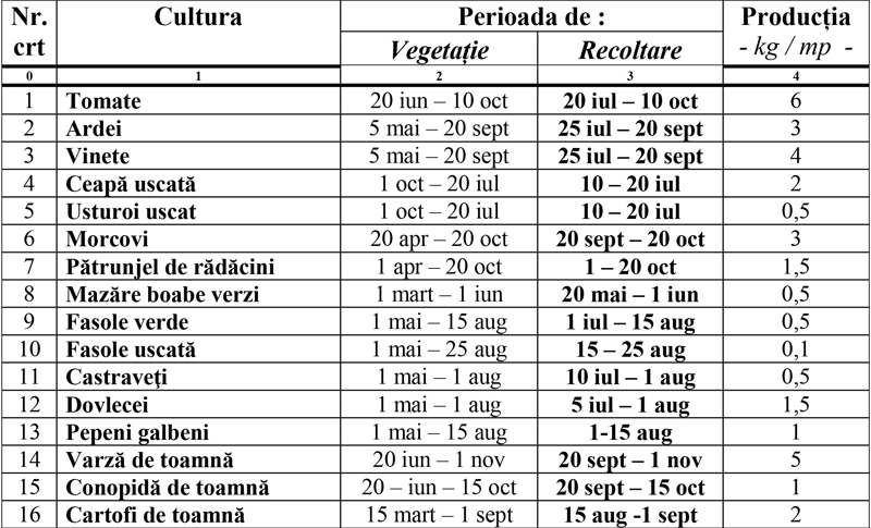Aceste date vă sunt de folos în a stabili suprafața pe care veți cultiva legume, după ce ați calculat nevoile familiei și / sau pe cele pentru comercializare.