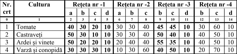 Componentele amestecurilor sunt: a – turbă, b – mraniţă, c – pământ de ţelină, d – nisip.