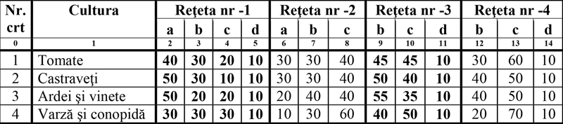 Atât producătorii, cât și consumatorii de legume își doresc apariția cât mai timpurie a celor proaspete și, dacă se poate, și trebuie să se poată, la prețuri rezonabile, benefice și pentru unii și pentru ceilalți. Desigur că acest lucru reclamă eforturi fizice și materiale suplimentare ceea ce se reflectă în prețul de pe piață. Mi-aș permite să recomand consumatorilor să prefere produsele autohtone, chiar mai puțin aspectuoase, celor foarte fercheșe din import, dar vectori purtători de substanțe toxice, ceea ce va supăra sigur, în timp, ficatul nostru, și numai pe el. Este bine știut că multe din aceste substanțe descoperite în legumele și fructele din import au chiar un pronunțat efect cancerigen la oameni. Să mai continui explicitarea acestui lucru? Pentru a oferi pieței produse mai sigure, sănătoase trebuie ca și producătorii lor să nu se mai lase impresionați de aspectul și productivitatea celor din import, căci acestea sunt însoțite de efectele nocive descrise mai sus. Din fericire, știința agricolă românească a creat la toate plantele de cultură din țara noastră soiuri și clone valoroase, bine adaptate condițiilor pedoclimatice locale, dar, din păcate pentru mulți dintre noi, ,,găina străinului e mai curcă decât a noastră”. Cine are urechi de auzit… Recomand așadar producătorilor de răsaduri și legume utilizarea soiurilor românești, iar consumatorilor cumpărarea acestor produse chiar dacă cele străine încântă mai mult ochiul și să nu uite că produsele consumate azi te pot îmbolnăvi irecuperabil mâine. Imediat ce zăpada se topește este timpul să instalăm răsadnițele încălzite cu biocombustibil cât și solariile, închiderea etanșă a acestora spre a provoca încălzirea rapidă a solului din ele și răsărirea primei tranșe de buruieni a căror distrugere este ușoară și se face o dată cu pregătirea terenului pentru semănat sau plantat, fără cheltuieli suplimentare. Sunt foarte utile în producerea răsadurile cuiburile nutritive pe bază de turbă și amestec nutritiv special. Redăm în continuare și câteva rețete de amestecuri nutritive pentru aceasta.