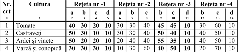 Atât producătorii cât și consumatorii de legume își doresc apariția cât mai timpurie a celor proaspete și dacă se poate, și trebuie să se poată, la prețuri rezonabile, benefice și pentru unii și pentru ceilalți. Desigur că acest lucru reclamă eforturi fizice și materiale suplimentare, ceea ce se reflectă în prețul de pe piață. Mi-aș permite să recomand consumatorilor să prefere produsele autohtone, chiar mai puțin aspectuoase, celor foarte fercheșe din import, dar vectori purtători de substanțe toxice, ceea ce va supăra sigur în timp ficatul nostru, și numai pe el. Este bine știut că multe din aceste substanțe descoperite în legumele și fructele din import au chiar un pronunțat efect cancerigen la oameni. Să mai continui explicitarea acestui lucru? Pentru a oferi pieței produse mai sigure, sănătoase, trebuie ca și producătorii lor să nu se mai lase impresionați de aspectul și productivitatea celor din import, căci acestea sunt însoțite de efectele nocive descrise mai sus. Din fericire știința agricolă românească a creat la toate plantele de cultură din țara noastră soiuri și clone valoroase, bine adaptate condițiilor pedoclimatice locale, dar din păcate pentru mulți dintre noi ,,găina străinului e mai curcă decât a noastră”. Cine are urechi de auzit … Recomand așadar producătorilor de răsaduri și legume utilizarea soiurilor românești, iar consumatorilor cumpărarea acestor produse, chiar dacă cele străine încântă mai mult ochiul și să nu uite că produsele consumate azi te pot îmbolnăvi irecuperabil mâine. Imediat ce zăpada se topește, dacă a nins cumva, este timpul să instalăm răsadnițele încălzite cu biocombustibil cât și solariile, udarea și închiderea etanșă a acestora spre a provoca încălzirea rapidă a solului din ele și răsărirea primei tranșe de buruieni, a căror distrugere este ușoară și se face odată cu pregătirea terenului pentru semănat sau plantat, fără cheltuieli suplimentare. Sunt foarte utile în producerea răsadurile cuiburile nutritive pe bază de turbă și amestec nutritiv special. Redăm în continuare și câteva rețete de amestecuri nutritive pentru aceasta.