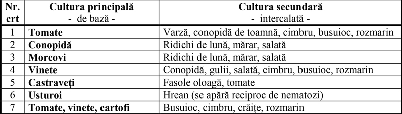 6 – Asocierea culturilor care presupune intercalarea printre rândurile culturii de bază a unor culturi sau plante care mai ales prin uleiurile eterice pe care le emană tulbură sistemul de orientare al unor dăunători și astfel îi îndepărtează pe aceștia de plantele de cultură. Astfel, printre rândurile de cartofi, tomate, ardei, vinete, se plantează cimbru, busuioc, măghiran pentru îndepărtarea gândacilor din Colorado, ori hrean prin cultura de usturoi pentru alungarea nematozilor acestuia. De asemenea, se inserează prin toate culturile legumicole rânduri de crăițe (Tagetes sp.) pentru îndepărtarea viermilor sârmă din sol. Redăm în tabelul de mai jos un model de asociere, cu precizarea că această asociere se practica la noi „din negura vremilor”, fără explicații științifice, dar cu efecte majore în protejarea recoltelor.