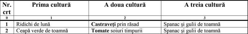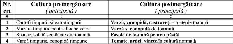În legumicultură, mai ales pe micile grădini familiale, se pot obține două sau chiar trei recolte pe an, prin culturi anticipate, de bază și succesive. Pentru aceasta, terenul trebuie să fie puternic fertilizat cu gunoi de grajd bine compostat și asigurată apa din abundență spre a susține obținerea acestor recolte. Redăm o structură de culturi legumicole pentru recolte multiple.