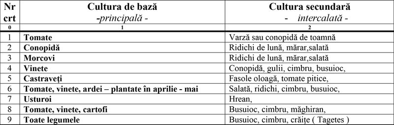 Pentru a susține și simplifica combaterea bolilor, buruienilor și dăunătorilor în legumicultură, mai cu seamă în grădinile familiale se recomandă asocierea mai multor culturi alături de culturile de bază, fără a reduce producția acestora, ba chiar aceasta va spori și mai ales va necesita un consum mai redus de pesticide.