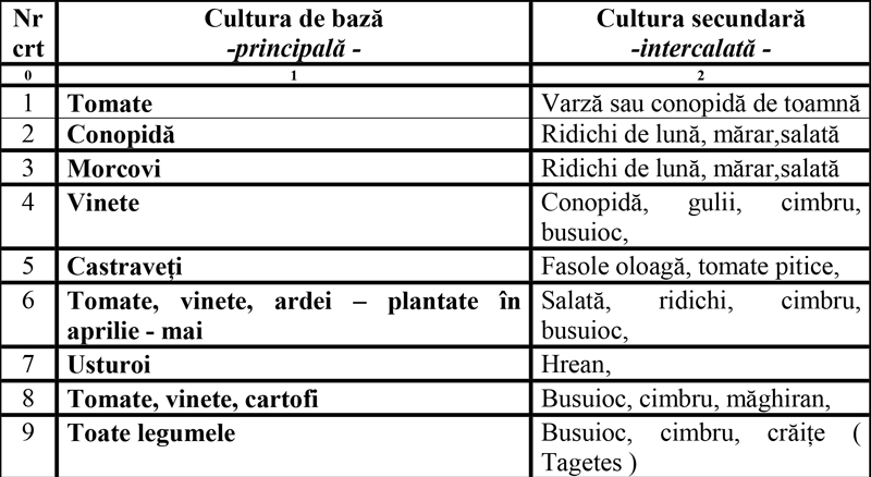 Pentru a susține și simplifica combaterea bolilor, buruienilor și dăunătorilor în legumicultură, mai cu seamă în grădinile familiale, se recomandă asocierea mai multor culturi alături de culturile de bază, fără a reduce producția acestora, ba chiar aceasta o va spori, și mai ales va necesita un consum mai redus de pesticide.