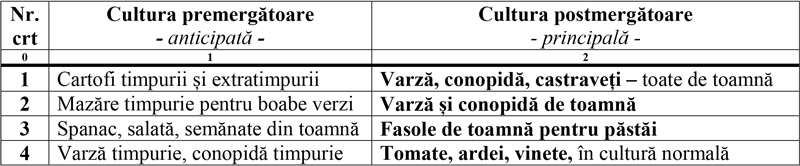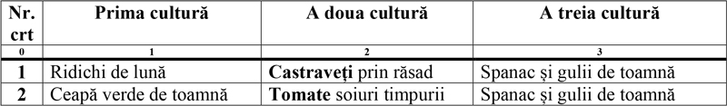 În legumicultură, mai ales pe micile grădini familiale, se pot obține 2 sau chiar 3 recolte pe an prin culturi anticipate, de bază și succesive. Pentru aceasta terenul trebuie să fie puternic fertilizat cu gunoi de grajd bine compostat și asigurată apa din abundență, spre a susține obținerea acestor recolte. Redăm o structură de culturi legumicole pentru recolte multiple.