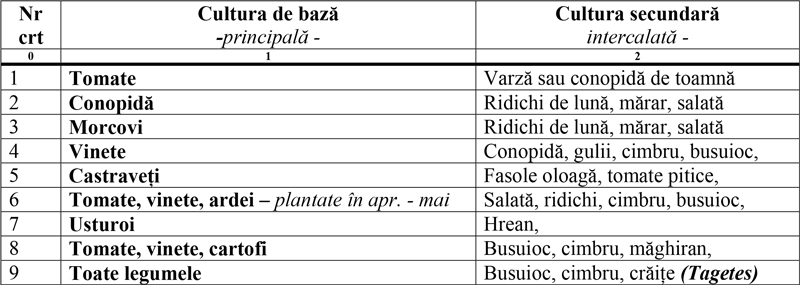 Pentru a susține și simplifica combaterea bolilor, buruienilor și dăunătorilor în legumicultură, mai cu seamă în grădinile familiale, se recomandă asocierea mai multor culturi alături de culturile de bază, fără a reduce producția acestora, ba chiar aceasta va spori și, mai ales, va necesita un consum mai redus de pesticide.
