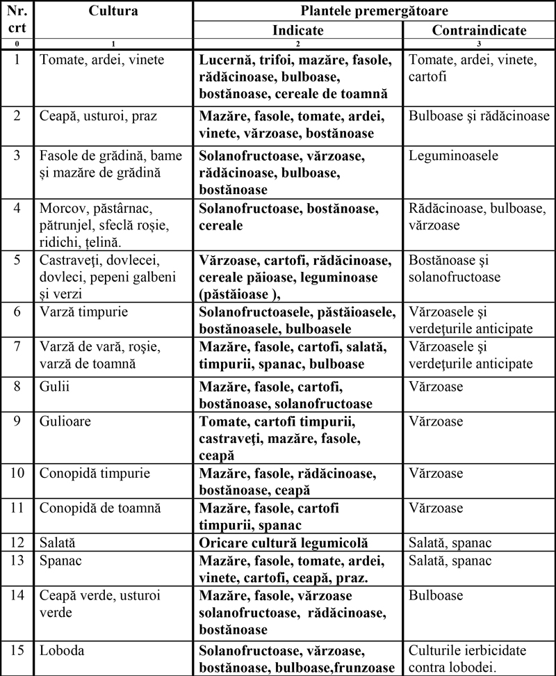 În cultura plantelor, deci și a legumelor, un factor foarte important în obținerea de recolte bogate, sănătoase și mai ieftine îl constituie planta premergătoare. Ea poate fi o puternică sursă de boli, buruieni sau dăunători, este cazul plantelor contraindicate, sau o sursă de condiții favorabile, este cazul premergătoarelor indicate, care pot spori volumul și calitatea recoltelor precum și reduce costurile, mai ales cu protecția fitosanitară a acestora.
