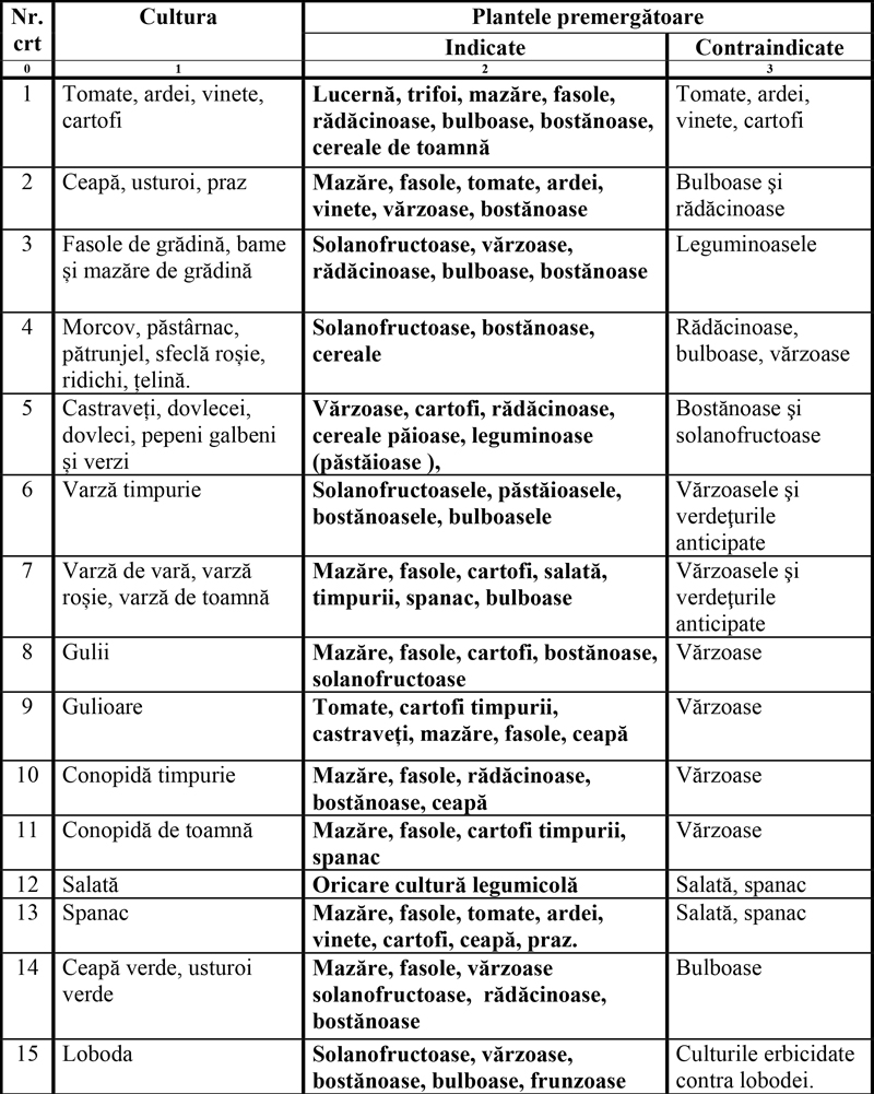 În cultura plantelor, deci și a legumelor, un factor foarte important în obținerea de recolte bogate, sănătoase și mai ieftine, îl constituie planta premergătoare. Ea poate fi o puternică sursă de boli, buruieni sau dăunători, este cazul plantelor contraindicate, sau o sursă de condiții favorabile, este cazul premergătoarelor indicate, care pot spori volumul și calitatea recoltelor, precum și reduce costurile, mai ales cu protecția fitosanitară a acestora.