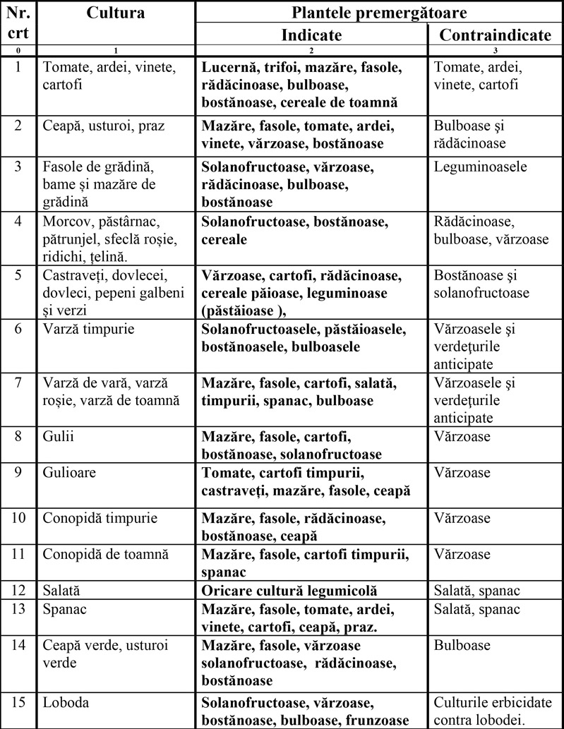 În cultura plantelor, deci și a legumelor, un factor foarte important în obținerea de recolte bogate, sănătoase și mai ieftine, îl constituie planta premergătoare. Ea poate fi o puternică sursă de boli, buruieni sau dăunători, este cazul plantelor contraindicate, sau o sursă de condiții favorabile, este cazul premergătoarelor indicate, care pot spori volumul și calitatea recoltelor, precum și reduce costurile, mai ales cu protecția fitosanitară a acestora.