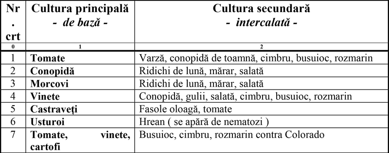 Astăzi se apreciază că la 4 rânduri de cartofi, vinete sau tomate este bine să fie un rând de busuioc, rozmarin sau cimbru. Dacă bordurăm solele și cu crăițe și hrean aven un spor de certitudine în protecția acestor culturi. De altfel busuiocul, cimbrul, lavanda, crăițele, hreanul, rozmarinul pot și trebuie să fie intercalate printre toate culturile legumicole. Le vor proteja și vor crea aspecte și atmosferă plăcute locului respectiv.