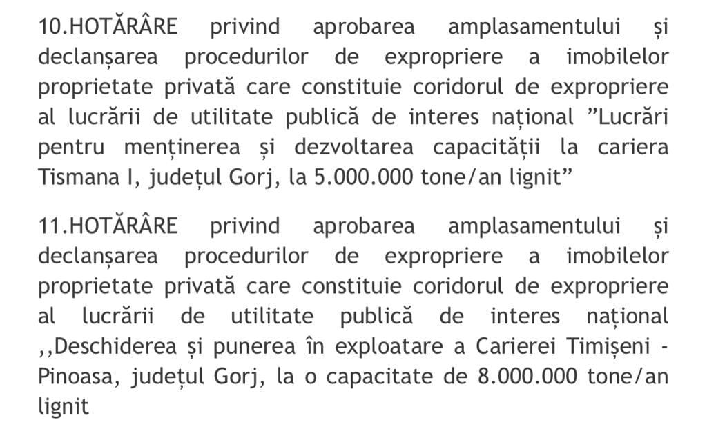 Guvernul a adoptat, în ședința de Guvern de miercuri, proiecte de hotărâre care permit eliberarea culoarelor de expropriere astfel încât să fie extinse carierele Tismana I și Pinoasa. „PNL a demonstrat că este interesat de dezvoltarea activității la CE Oltenia, atât în Guvernul Orban, cât și în Cabinetul Cîțu”, a transmis deputatul PNL, Dan Vîlceanu.
