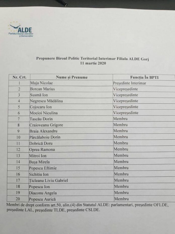 ALDE Gorj condus de Nicolae Muja are un nou Birou Politic Interimar. Din acesta fac parte, Borcan Marius, Susmă Ion, Mădălina Negrescu, Ion Cojocaru și Mocioi Niculina, cu funcții de vicepreședinți. Organismul politic are și 14 membri, printre aceștia numărându-se Dorin Tașcău, Alexandru Braia, Craioveanu Grigore, Pârcălăboiu Dorin, Oprea Ramona, Doru Dobrică și Eftemie Popescu.